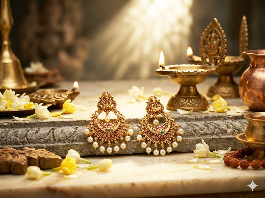 Antique Gold-Finish Temple Motif Earrings with Pearl Drops