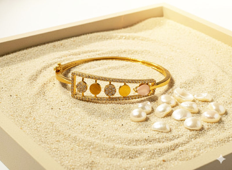 | Base Material: Gold-tone metal alloy Stone Type: Clear cubic zirconia/crystals and a synthetic pink stone Bangle Type: Rigid, hinged statement bracelet Closure: Side clasp with hinge Architectural Design: A unique rectangular frame that draws the eye. Mixed Textures: Alternating smooth/matte gold discs and brilliant pave-set stone discs. Color Accent: A soft pink pear-cut stone adds a subtle, feminine touch to the gold and clear crystal palette. Ease of Wear: Designed with a side hinge and clasp for a comfortable, secure fit. |