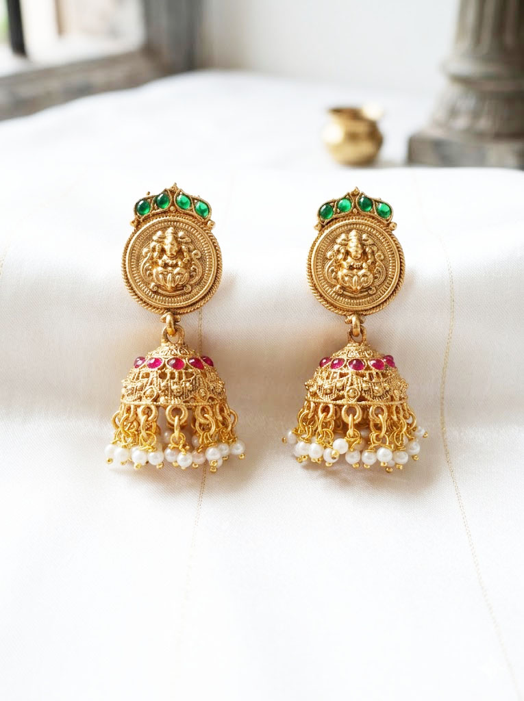 | Embrace traditional elegance with these exquisite temple jewelry-style jhumkas. The design features a beautifully detailed, embossed circular motif of Lord Ganesha on the stud, elegantly crowned with a trio of vibrant green stones. The classic bell-shaped dome exhibits intricate metalwork in a rich, antique gold finish, highlighted by a radiant band of pink stones wrapped around the upper tier. The piece is finished with delicate faux pearl clusters that dangle gracefully from the base, creating a timeless accessory perfect for festive occasions, weddings, and cultural celebrations. |