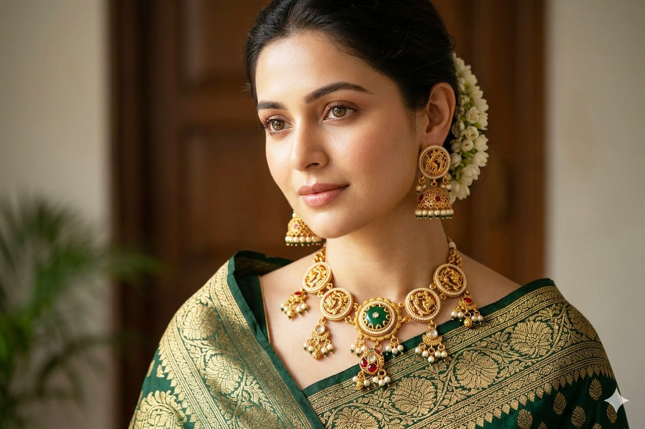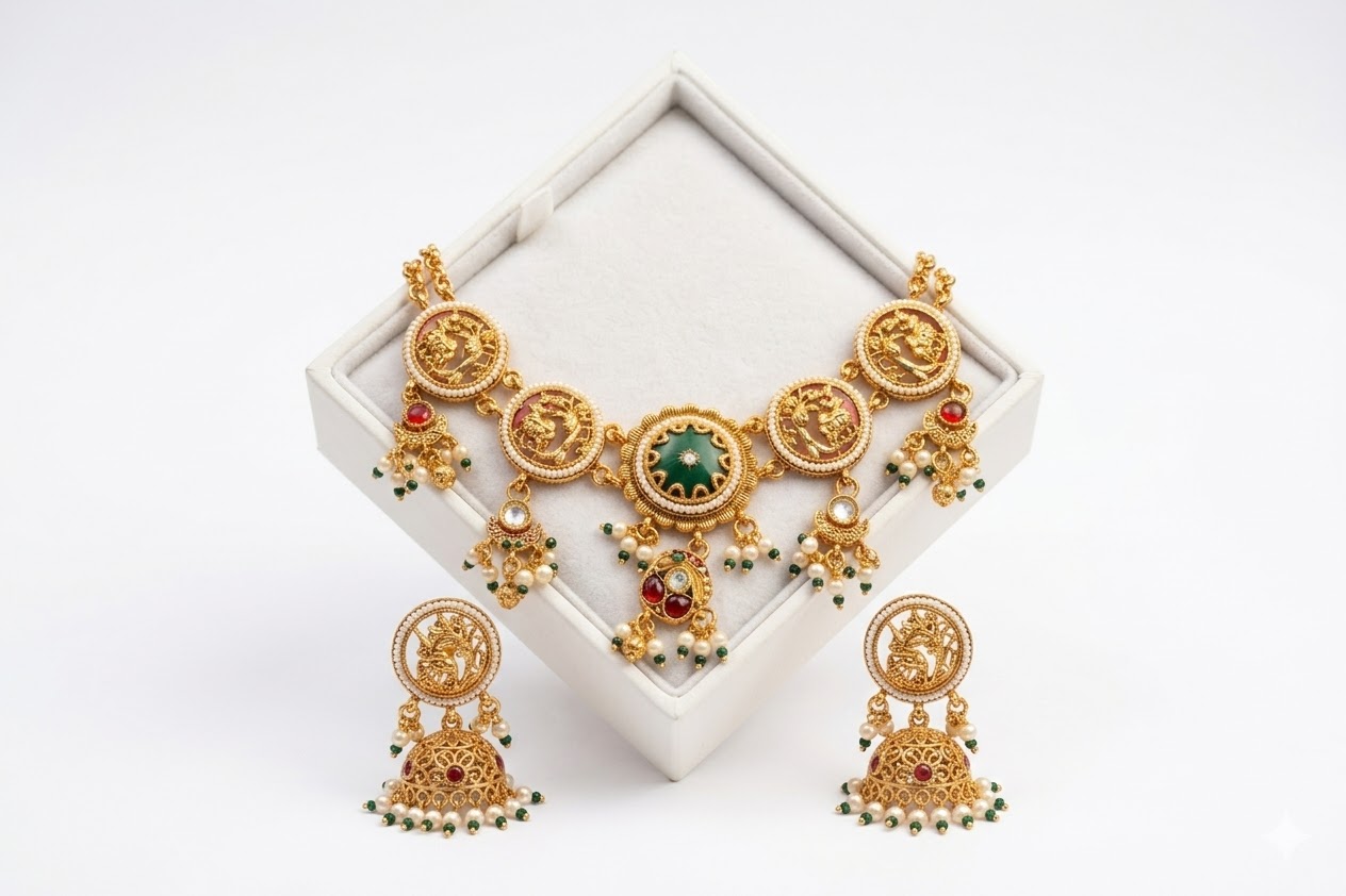 Elevate your ethnic ensemble with this exquisite Nakshi-style choker set, a masterpiece of traditional craftsmanship. The necklace features circular medallions intricately embossed with divine motifs, interconnected by a sturdy double-layered gold-toned chain. At its heart lies a striking emerald-green cabochon stone, encircled by fine gold work and delicate pearl detailing. The lower border of the choker is adorned with cascading clusters of seed pearls and emerald-green beads, providing a rhythmic movement and a regal finish. Paired with matching statement earrings, this set is designed for the modern woman who cherishes her cultural roots.