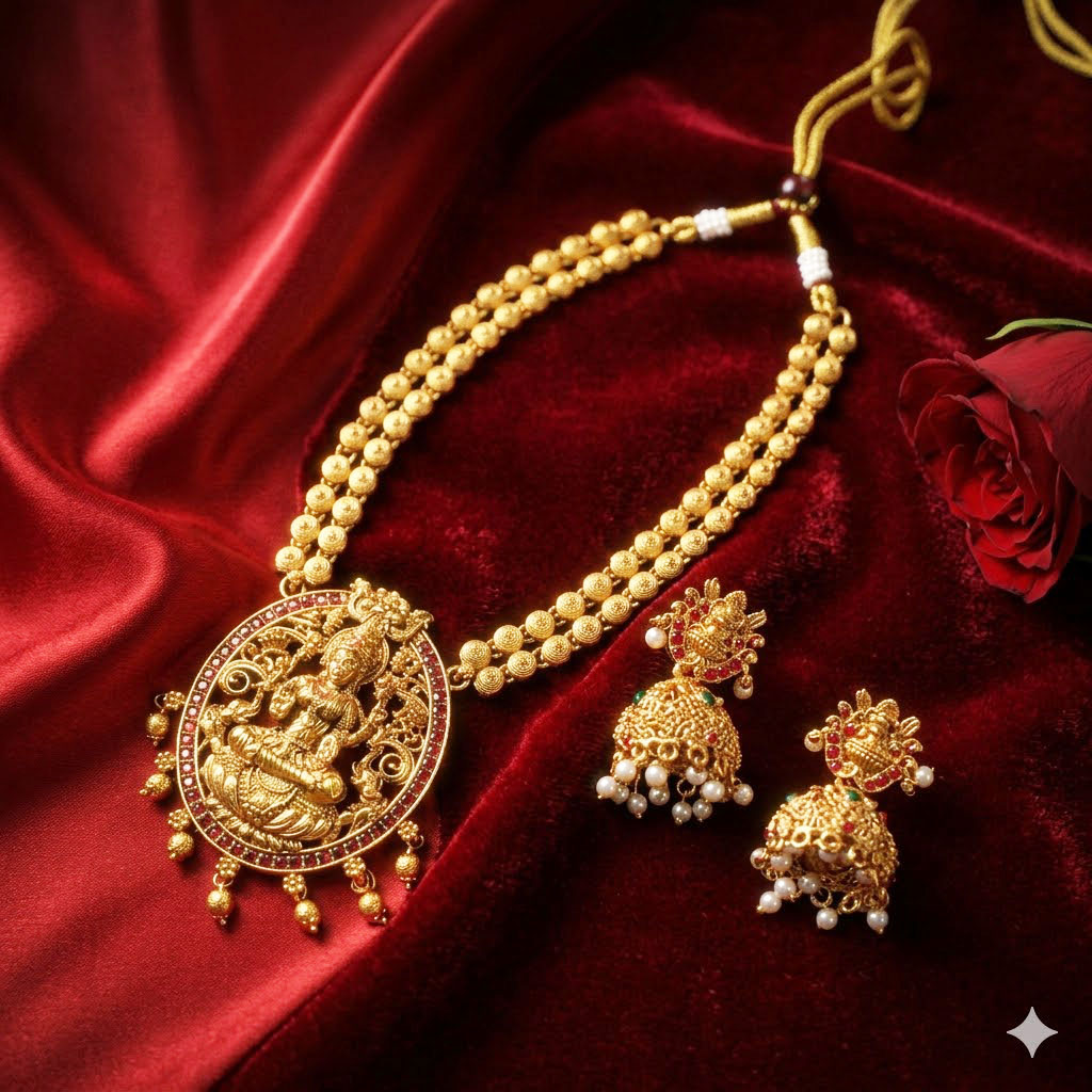 Exude timeless elegance with this exquisitely crafted Temple Jewelry set. This masterpiece features a prominent circular medallion pendant depicting Goddess Lakshmi in a seated posture, symbolizing prosperity and grace. The pendant is intricately framed with traditional floral motifs and delicate gold bead droplets. The necklace is composed of a dual-layered “Kasu” style chain, leading to an adjustable drawstring for a custom fit. Accompanied by matching Jhumka earrings adorned with seed pearls, this set is a perfect blend of heritage artistry and regal sophistication.