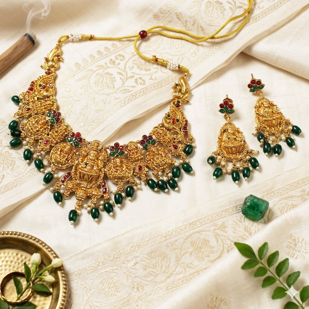 Divine Lakshmi Temple Jewelry Choker Set with Emerald Green Beads and Ruby Accents.