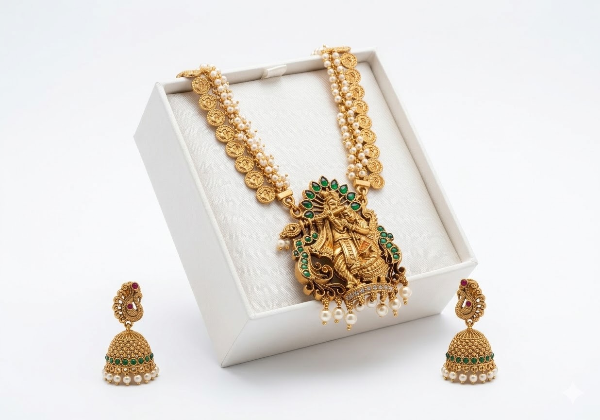 | Embrace spiritual elegance with this stunning Temple Jewelry set. The centerpiece is a grand, high-relief pendant depicting Lord Krishna playing the flute, surrounded by intricate peacock motifs and shimmering emerald-green stonework. The necklace features a dual-strand design: a classic Kasu Mala (coin chain) paired with a delicate moti (pearl) string, blending traditional heritage with a refined aesthetic. The accompanying Jhumka earrings mirror the pendant’s detail, creating a cohesive and majestic look perfect for weddings, festivals, and cultural celebrations. |
