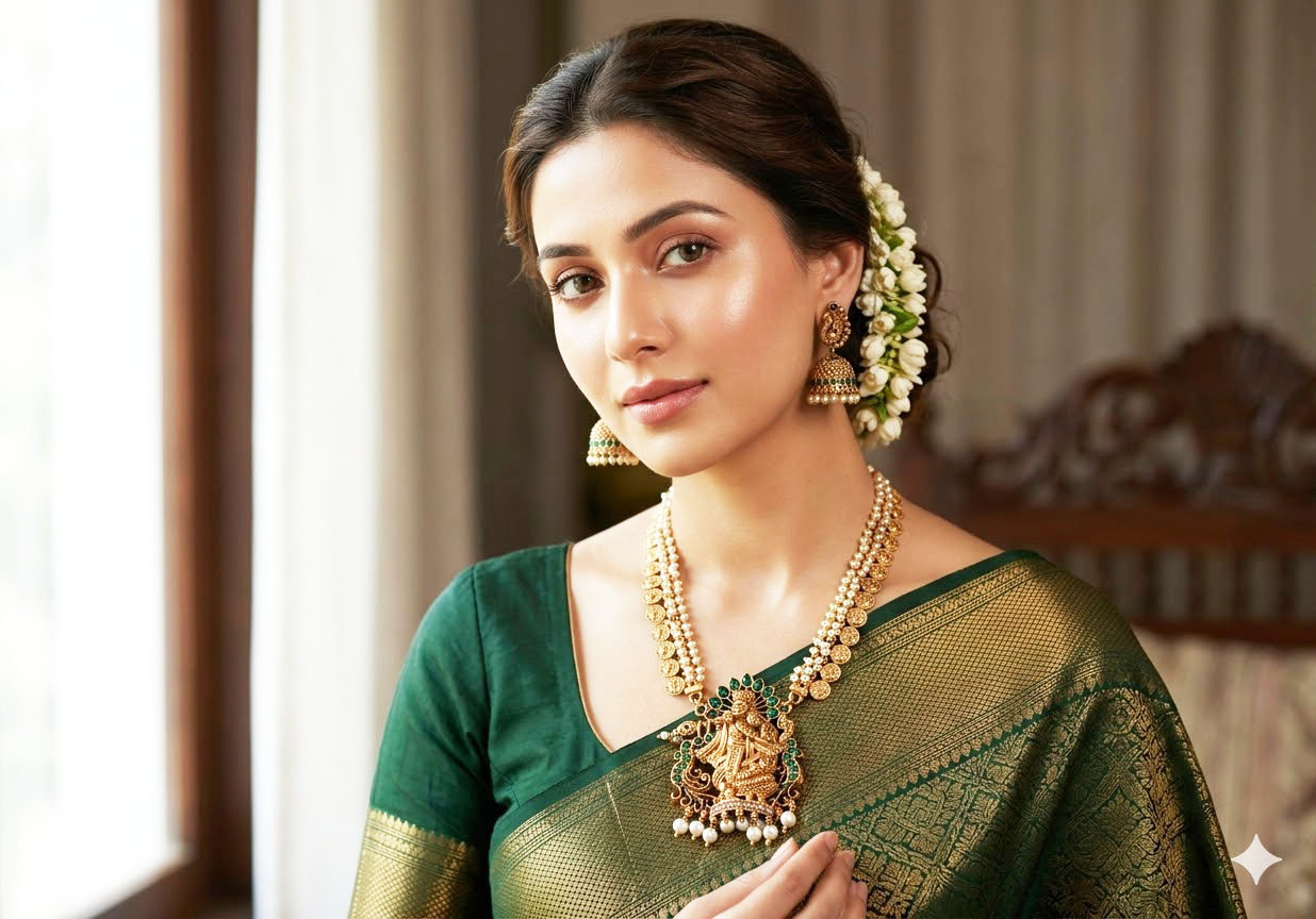 | Material: High-quality alloy with Antique Gold Finish Stone Type: Emerald Green Synthetic Stones & Faux Pearls Necklace Style: Long Haram / Kasu Mala Hybrid Earring Style: Traditional Jhumka with Push-back closure Pendant: Motif Fluting Krishna with Peacock accents Occasion: Bridal wear, Arangetram, Diwali, and festive gatherings. Weight: Mid-to-heavyweight for a premium feel. Set Includes: 1 Long Necklace and 1 Pair of Earrings. Care Instructions: Avoid contact with water and perfume. Store in the provided wooden box or a soft cloth pouch to maintain the antique luster. |
