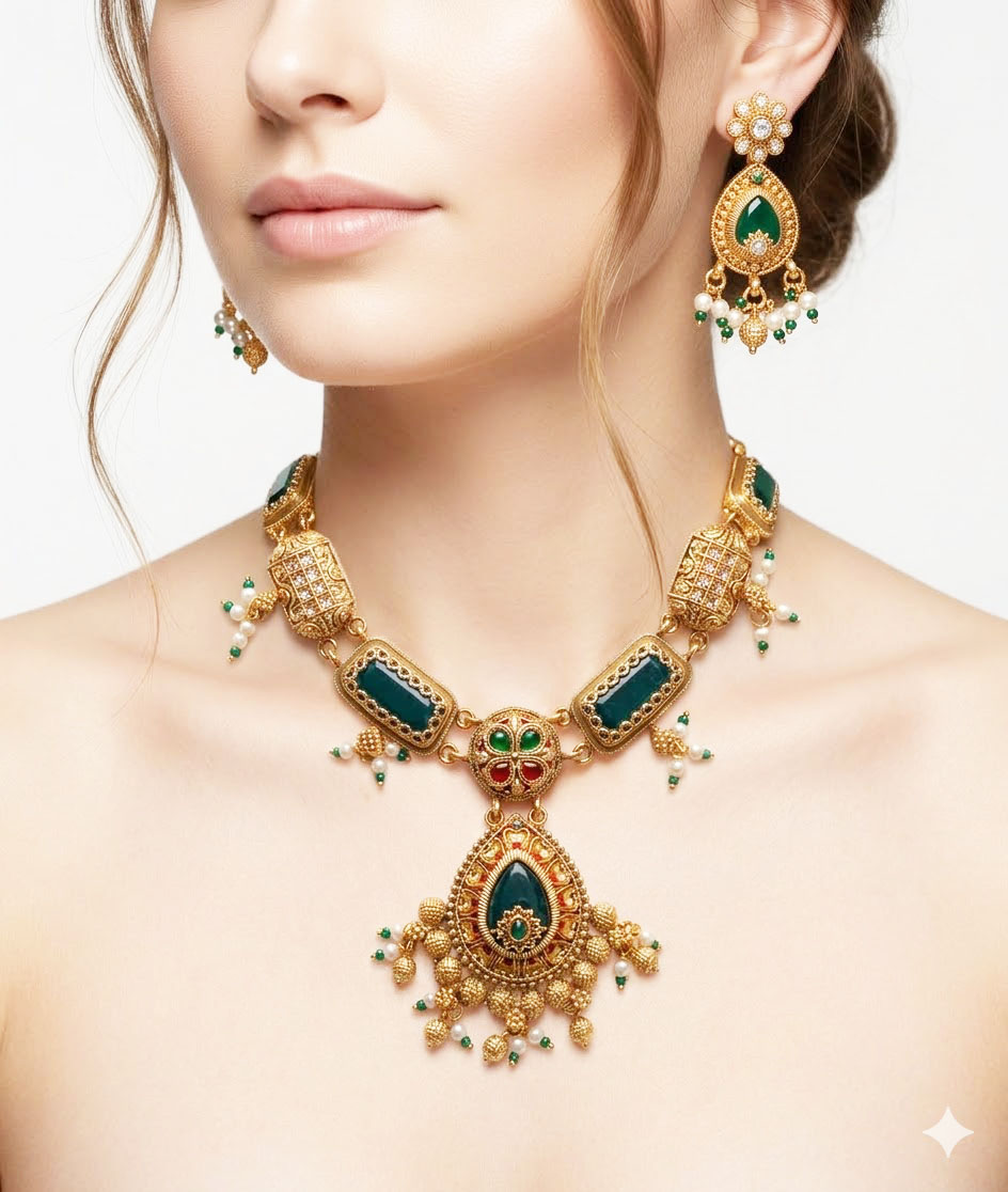 | This exquisite jewelry ensemble captures the timeless allure of traditional craftsmanship. The set features a stunning choker-style necklace and matching teardrop earrings, both meticulously finished in an antique gold tone. Centered with deep emerald green stones and accented with intricate Kundan work, the piece is further elevated by delicate pearl and green bead clusters that provide a graceful movement. Designed for the modern woman who cherishes heritage, this set adds a regal touch to any festive or bridal attire. |