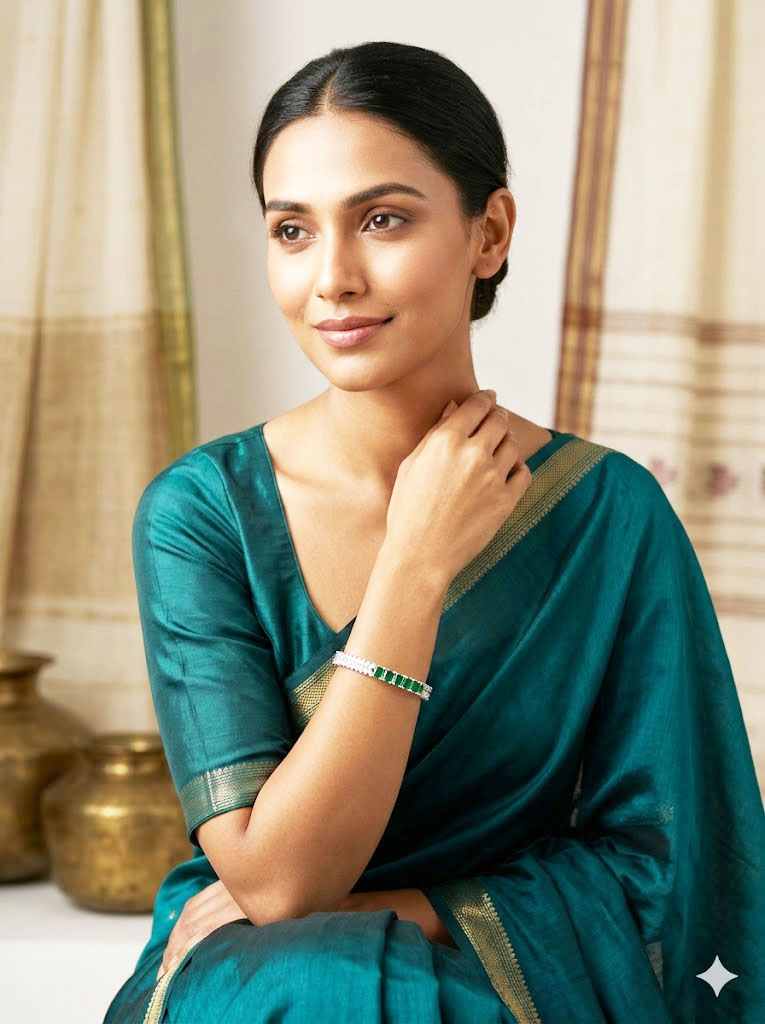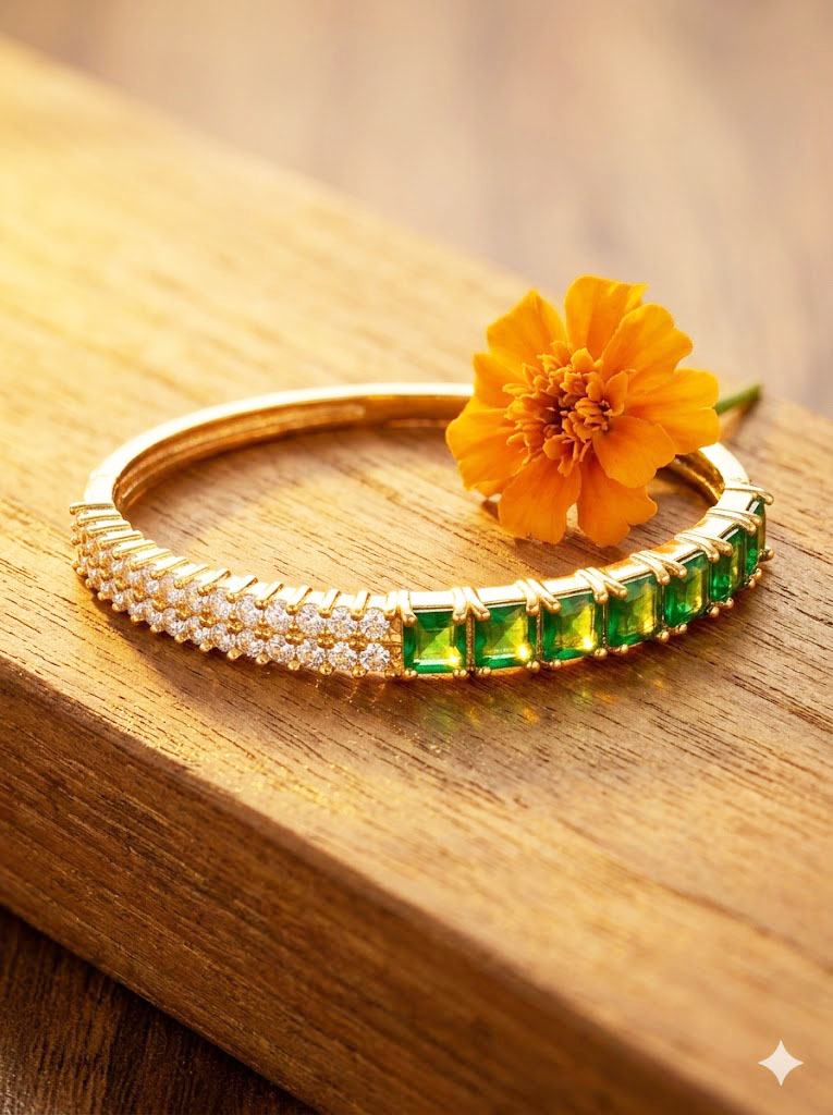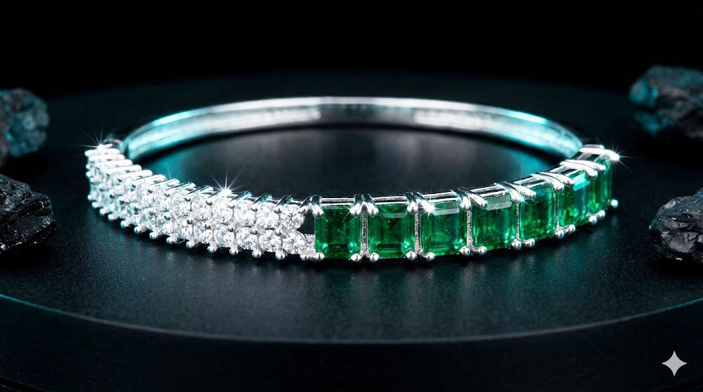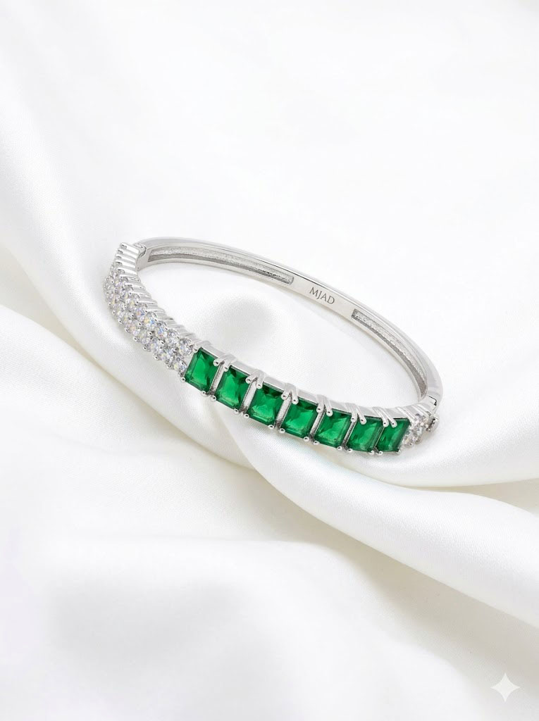 | Metal Finish: High-polish silver-tone Primary Stones: Rectangular, emerald-cut green stones Secondary Stones: Round, brilliant-cut clear stones (pave set) Bracelet Style: Oval hinged bangle |