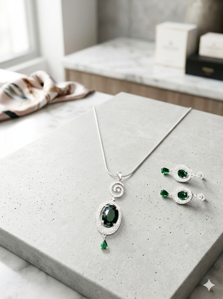 | Set Contents: 1 Pendant Necklace (with chain), 1 Pair of Earrings Primary Stone Color: Deep Green Secondary Stone Color: Clear / White Metal Tone/Finish: Silver-tone Chain Type: Smooth, flexible chain (appears to be a fine snake or box chain) Pendant Style: Oval halo with a top spiral motif and bottom teardrop dangle Earring Style: Drop/Dangle with a top accent stone |