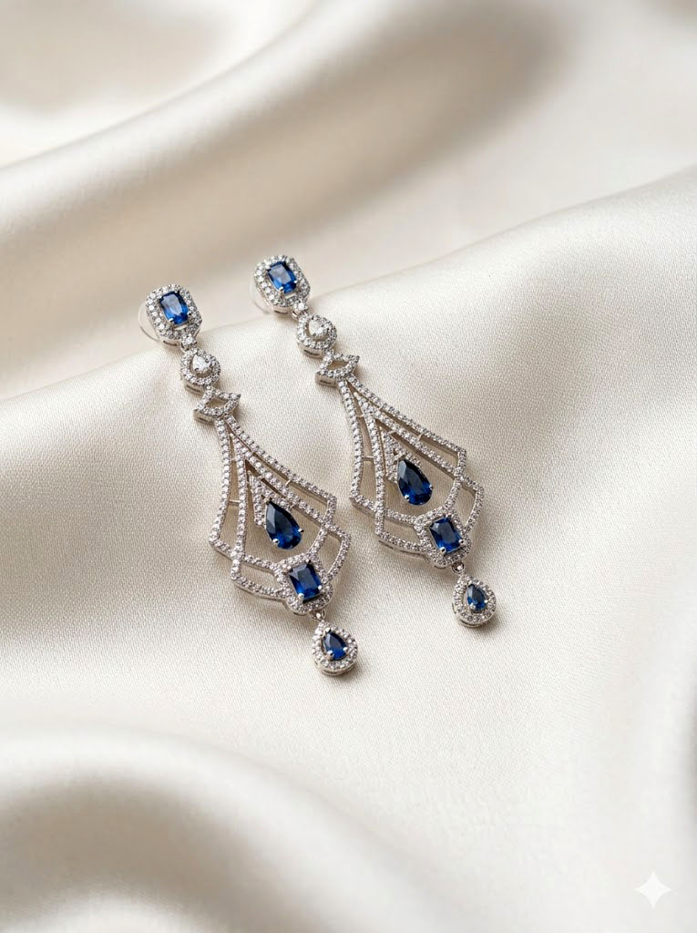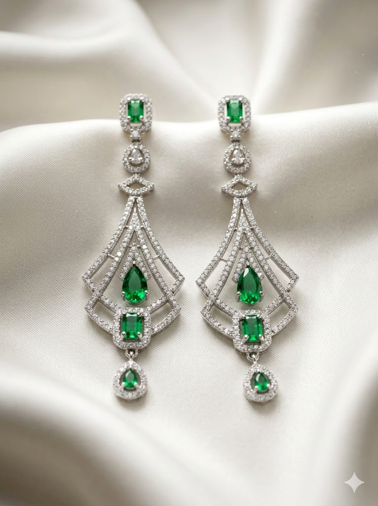 | Elevate any evening ensemble with these breathtaking chandelier earrings, featuring a sophisticated vintage-inspired Art Deco silhouette. The design showcases a brilliant silver-toned geometric framework, meticulously encrusted with sparkling clear stones. Vibrant, rich green stones in classic emerald and pear cuts serve as striking focal points, cascading elegantly to catch the light from every angle. These statement earrings offer a luxurious aesthetic, combining timeless elegance with impeccable craftsmanship for special occasions. |
