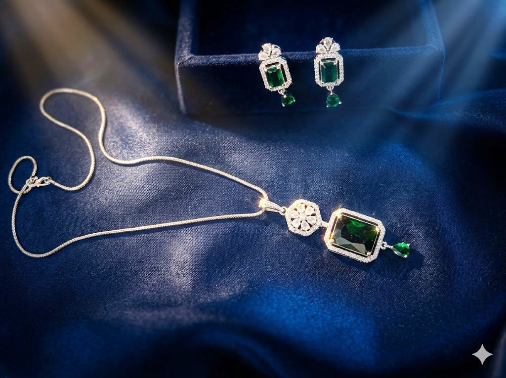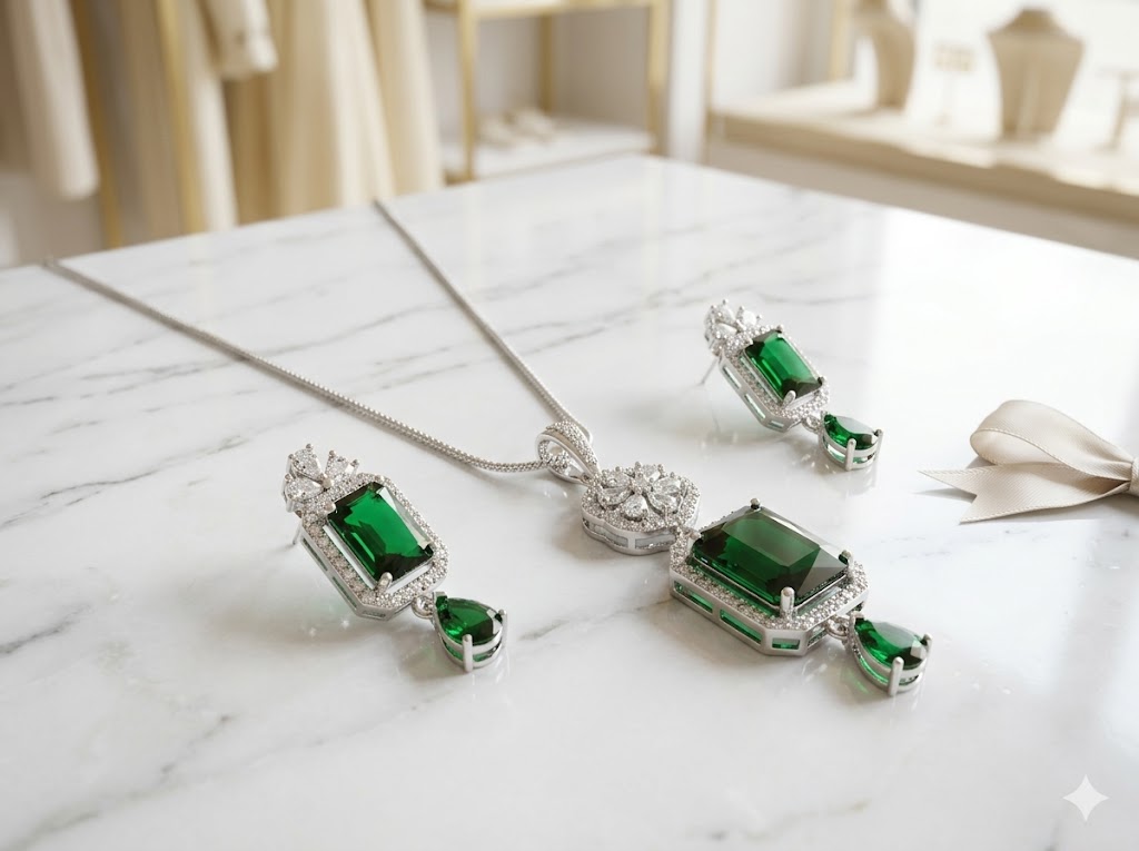 | Set Includes: 1 Pendant Necklace, 1 Pair of Drop Earrings Chain Type: Snake Chain Primary Stone Color: Deep Green Accent Stone Color: Clear / White Primary Stone Shape: Emerald Cut (Rectangular) Secondary Stone Shape: Teardrop / Pear (Dangle), Round/Marquise (Floral motif) Metal Tone: Silver |