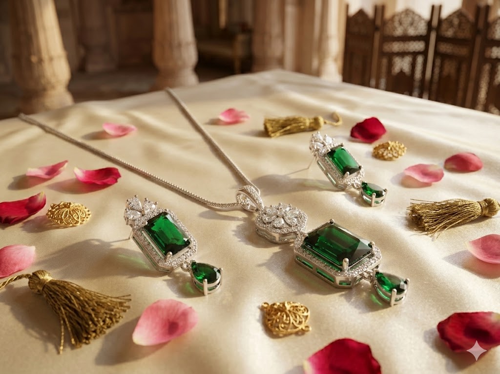 | Elevate your evening attire with this sophisticated pendant necklace and earring set. The design features striking, deep green faceted stones set against a brilliant silver-toned backdrop. Each piece is meticulously detailed with a halo of sparkling clear stones that beautifully amplify the rich color of the central gems. The pendant boasts a delicate spiral metallic motif and a captivating teardrop dangle, creating a graceful, elongated silhouette. Whether styled for a formal gala, a wedding reception, or presented as a luxurious gift, this set offers timeless elegance. |