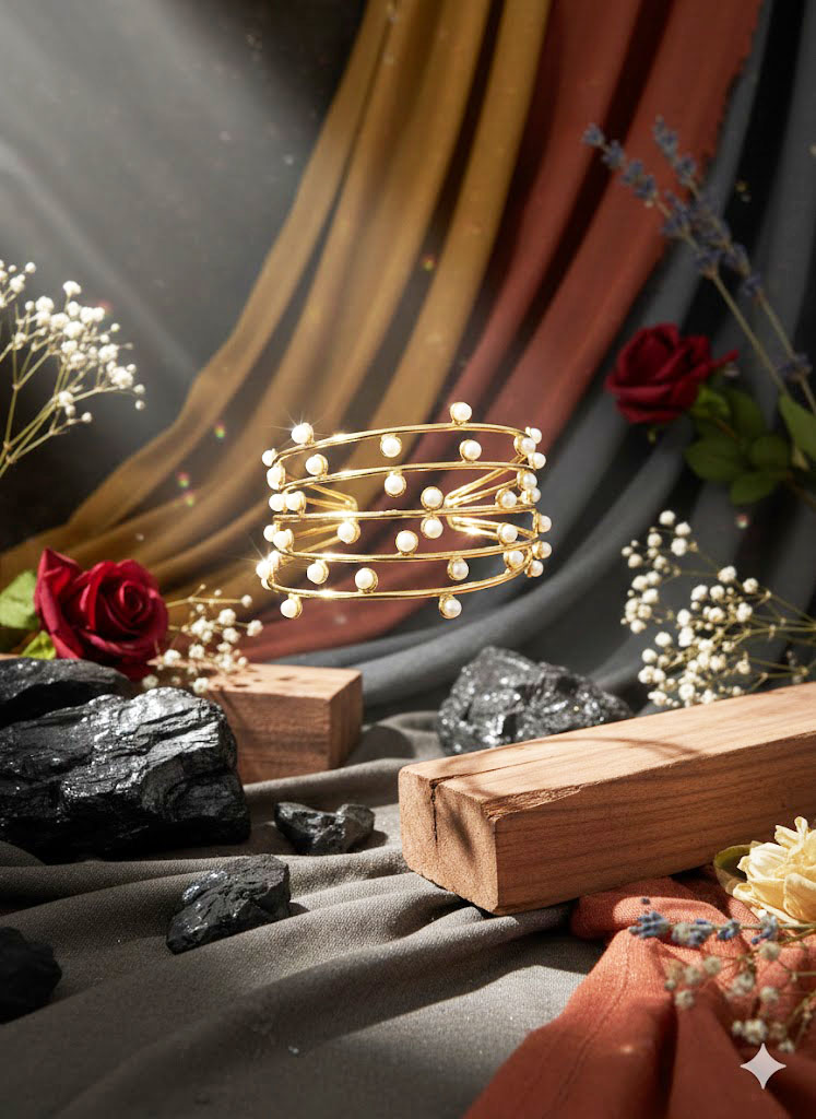 | Jewelry Type: Cuff Bracelet / Bangle Material: Gold-tone metal alloy and faux pearls Color Palette: Gold and White Closure: Open Cuff (No clasp) Design Element: Layered wire-wrap style Finish: Glossy gold plating |