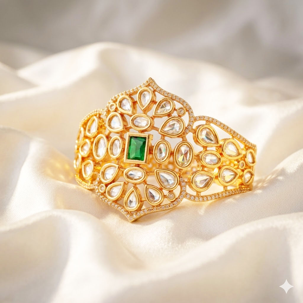 | Primary Stone: Square-cut Emerald Green Synthetic Gemstone. Accent Stones: High-Brilliance Pear and Round Moissanite. Metal Finish: Premium Gold Plating over a durable alloy. |