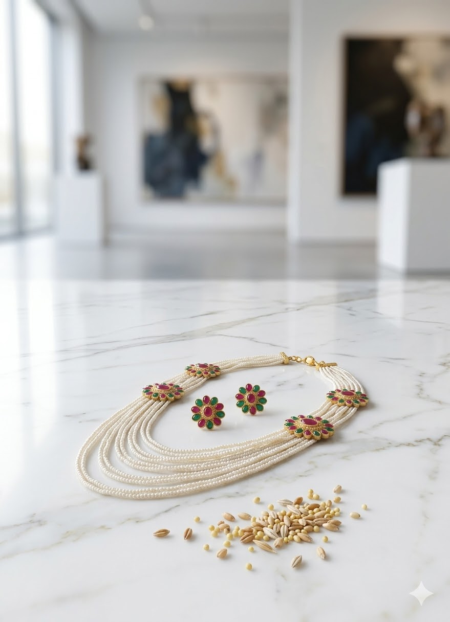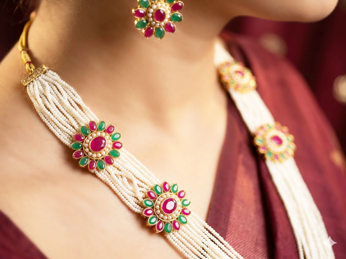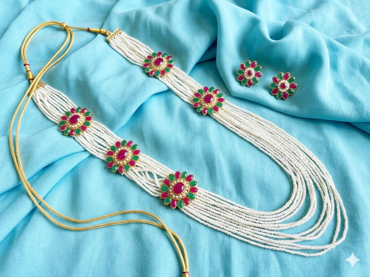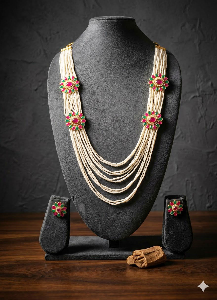 Material: High-quality faux pearls, gold-plated alloy base Stone Type: Synthetic Rubies, Emeralds, and Seed Pearls Necklace Type: Multi-strand Long Rani Haar Earring Style: Round Floral Studs Closure: Adjustable Silk Thread Tassel (Dori) Design: Floral-inspired circular motifs with kundan-style stone arrangements. Finish: Polished gold-tone finish for a premium aesthetic. Weight: Medium-weight, designed for extended wear during events.