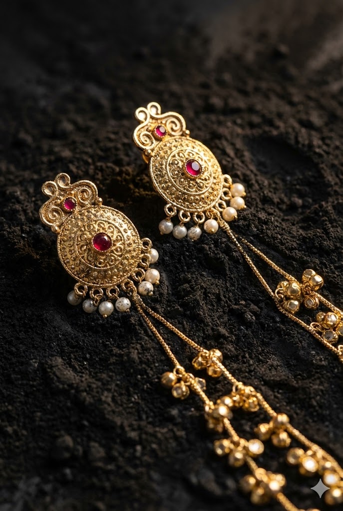 | Material: High-grade Alloy with 22K Gold Plating Stone Type: Synthetic Rubies & Faux Pearls Earring Type: Long Tassel / Drop Earrings Closure Type: Push Back / Post with Friction Back Weight: Lightweight to Medium Design Style: Antique/Ethnic Indian Finish: Matte Gold / Antique Polish Dimensions: Approximately 4 to 5 inches in length Occasion: Bridal Wear, Festivals (Diwali, Pongal), Ceremonial Events Care Instructions: Avoid contact with water, perfumes, and harsh chemicals. Store in a soft pouch to maintain the gold plating. |