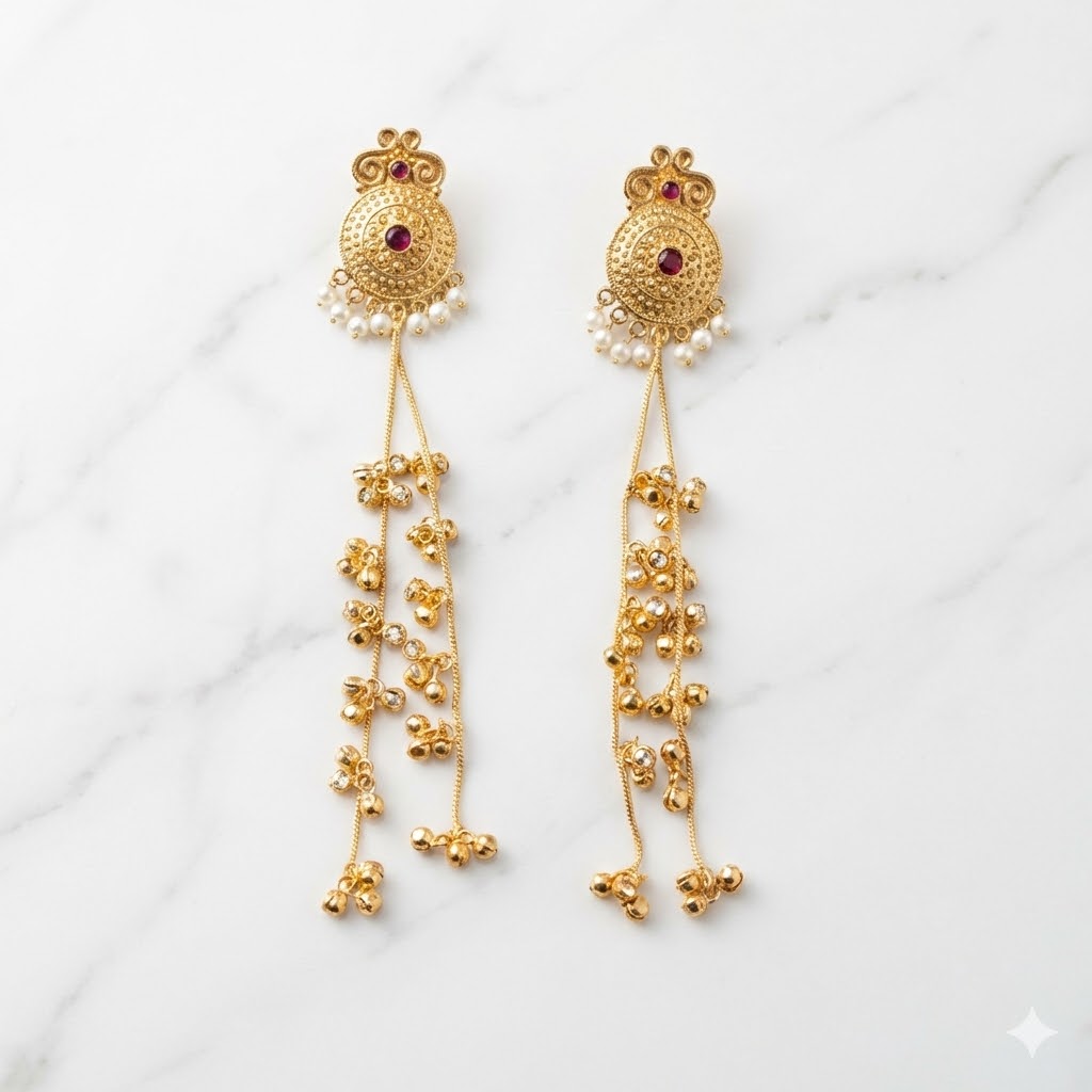 | These exquisite long-form earrings are a masterclass in traditional craftsmanship, drawing heavy inspiration from heritage Temple Jewelry. The design features a circular floral stud embellished with deep crimson ruby-toned stones and delicate seed pearl droplets. Extending from the base are multiple fine gold-tone chains adorned with Ghungroo-style golden beads, creating a fluid, cascading effect that offers both movement and a regal silhouette. |