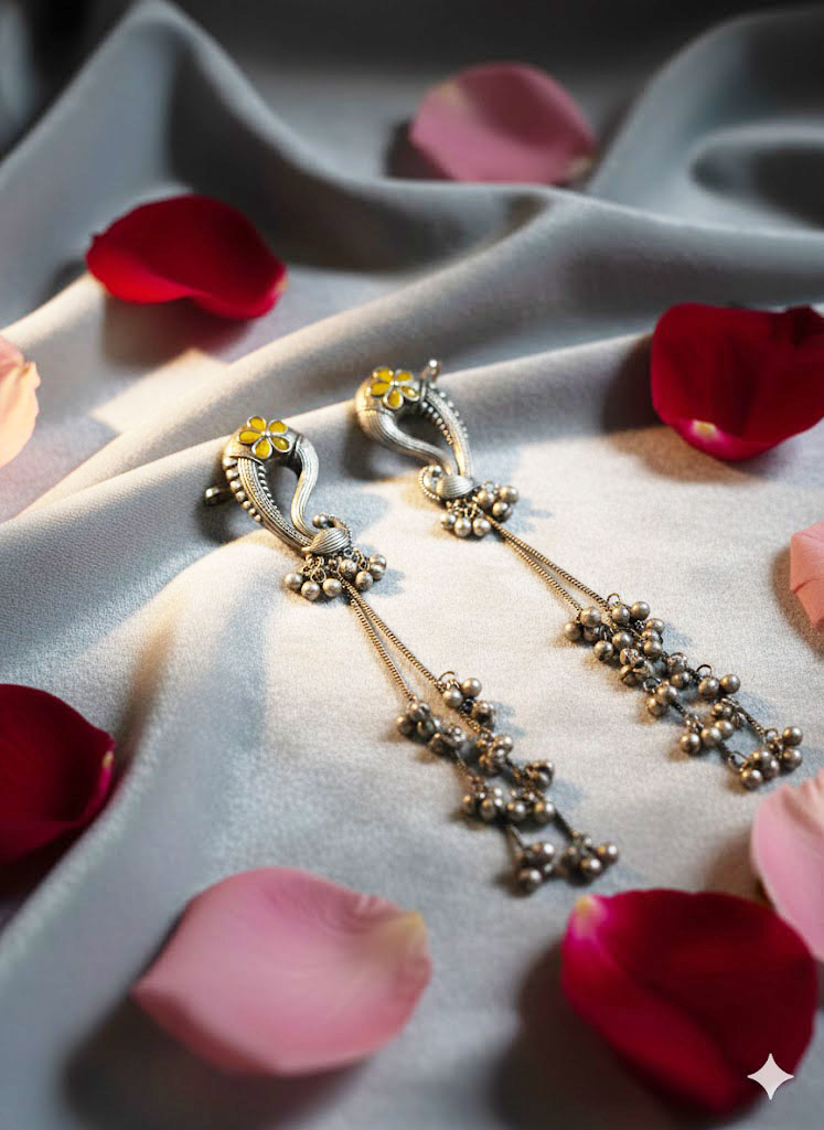 | Exude timeless elegance with these exquisitely crafted oxidized silver earrings. Featuring a sophisticated peacock-inspired silhouette, the design is centered around a vibrant yellow floral enamel motif that adds a pop of contemporary color to a traditional aesthetic. The long, delicate chain tassels are embellished with dainty silver beads (ghungroos), creating a graceful movement and a subtle, rhythmic sound. These earrings are a perfect blend of heritage artistry and modern bohemian flair. |