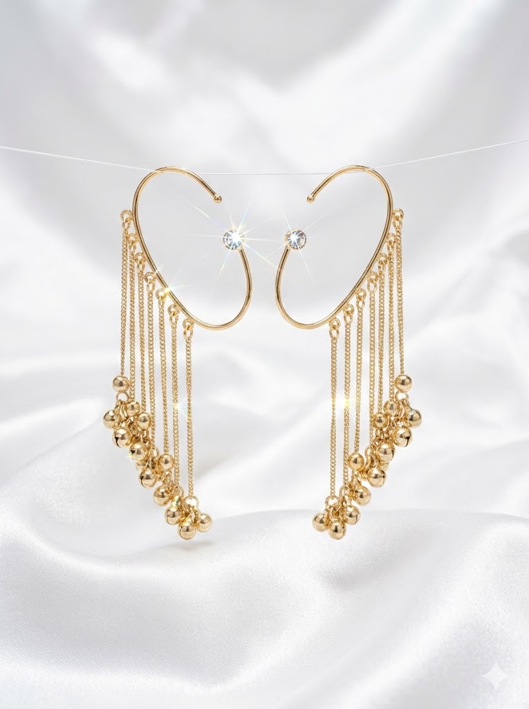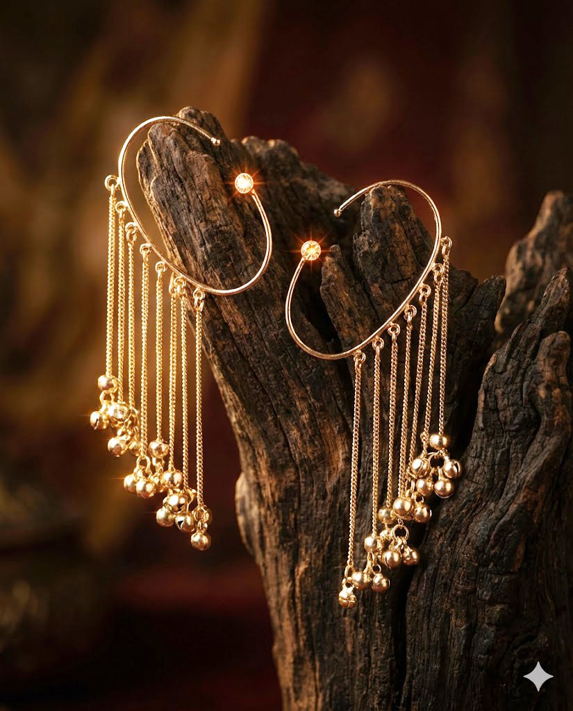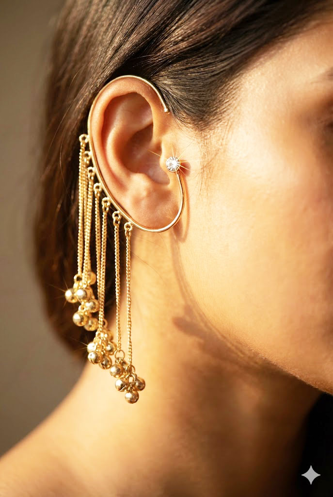 | Elevate your jewelry collection with these exquisite Golden Cascade Ear Cuffs. Designed to wrap elegantly around the contour of the ear, these cuffs feature a minimalist hoop structure accented by a brilliant, shimmering crystal stud. The highlight of the design is the series of delicate gold-toned tiered chains that drape gracefully, ending in polished spherical beads. These “ghungroo-style” drops create a mesmerizing movement and a soft visual rhythm, making them a perfect accessory for weddings, festive celebrations, or avant-garde fashion shoots. |