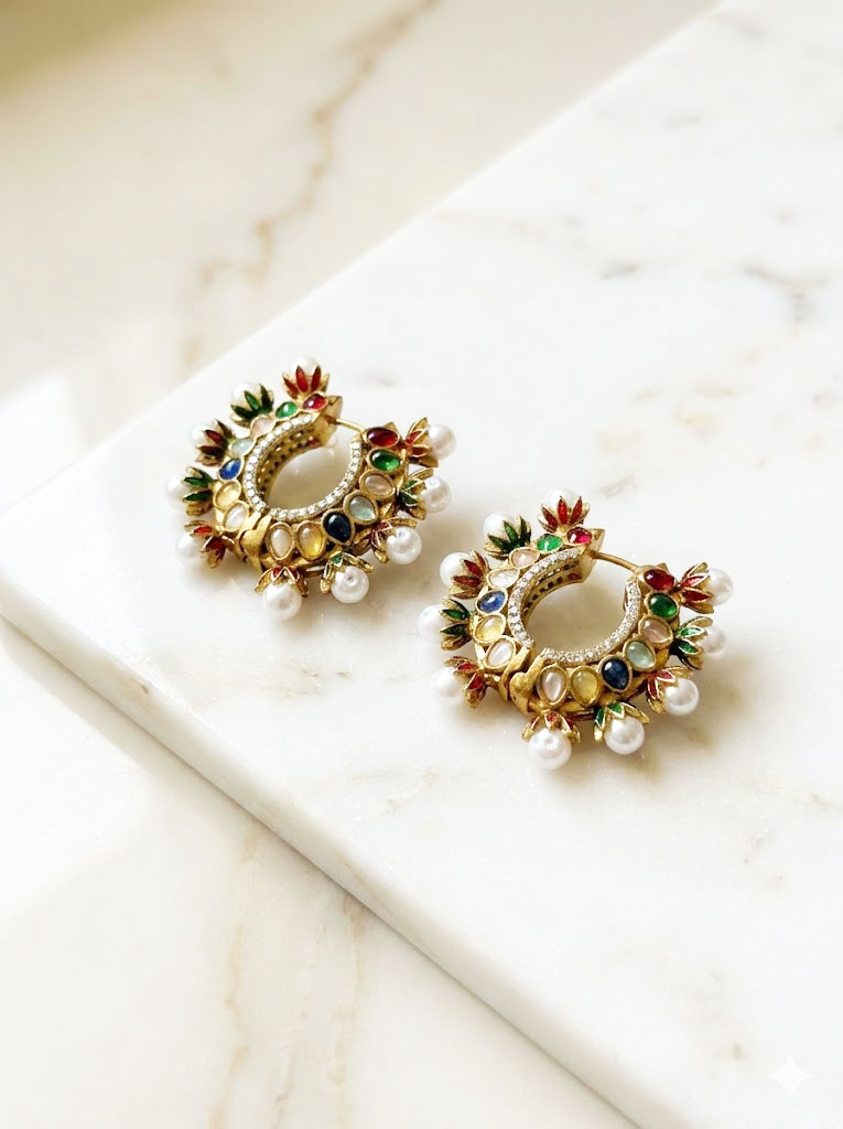 Exude timeless elegance with these meticulously crafted Chand Bali-style hoop earrings. Balancing traditional Indian aesthetics with a contemporary silhouette, these earrings feature a crescent-shaped base encrusted with high-quality moissanite polki stones. The outer perimeter is adorned with delicate pearl clusters, each nestled in a textured gold-toned petal casing, creating a blooming floral effect. Finished in a rich matte antique gold plating, these earrings are designed to be a versatile statement piece for weddings, festivities, and high-fashion ethnic ensembles.