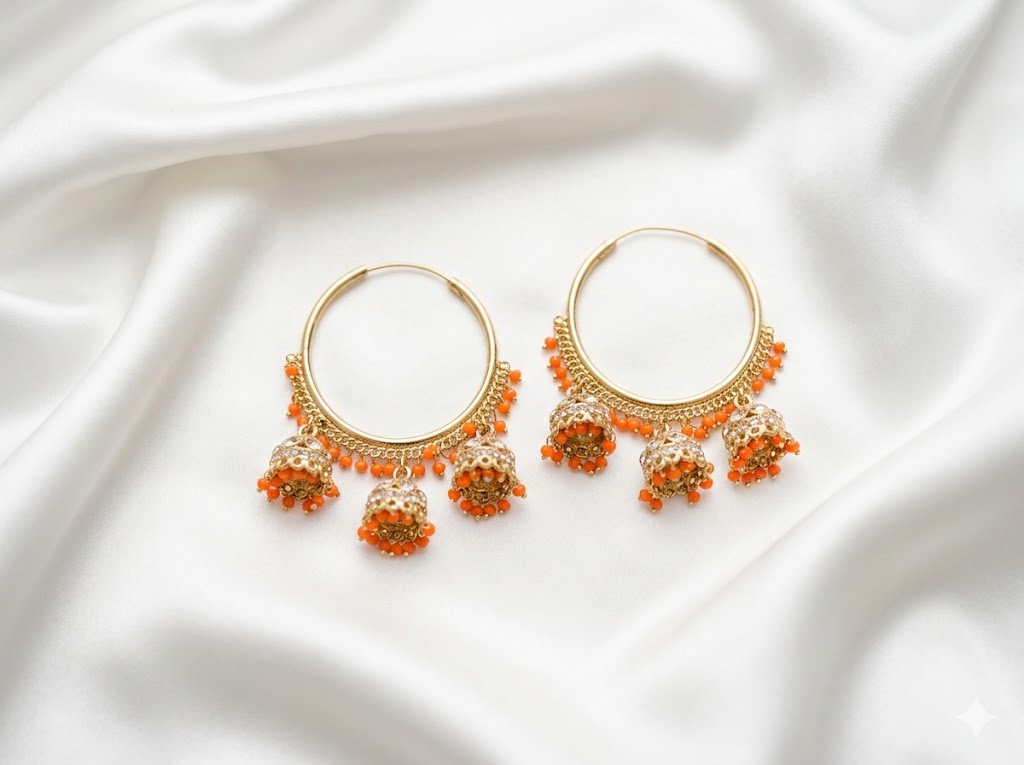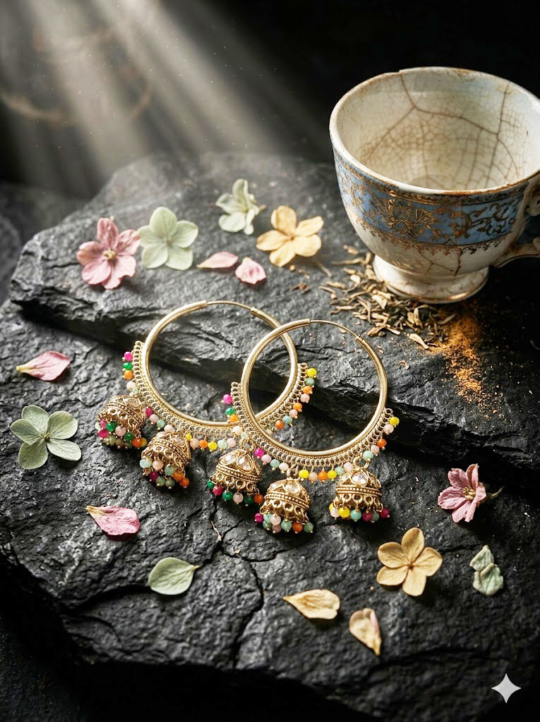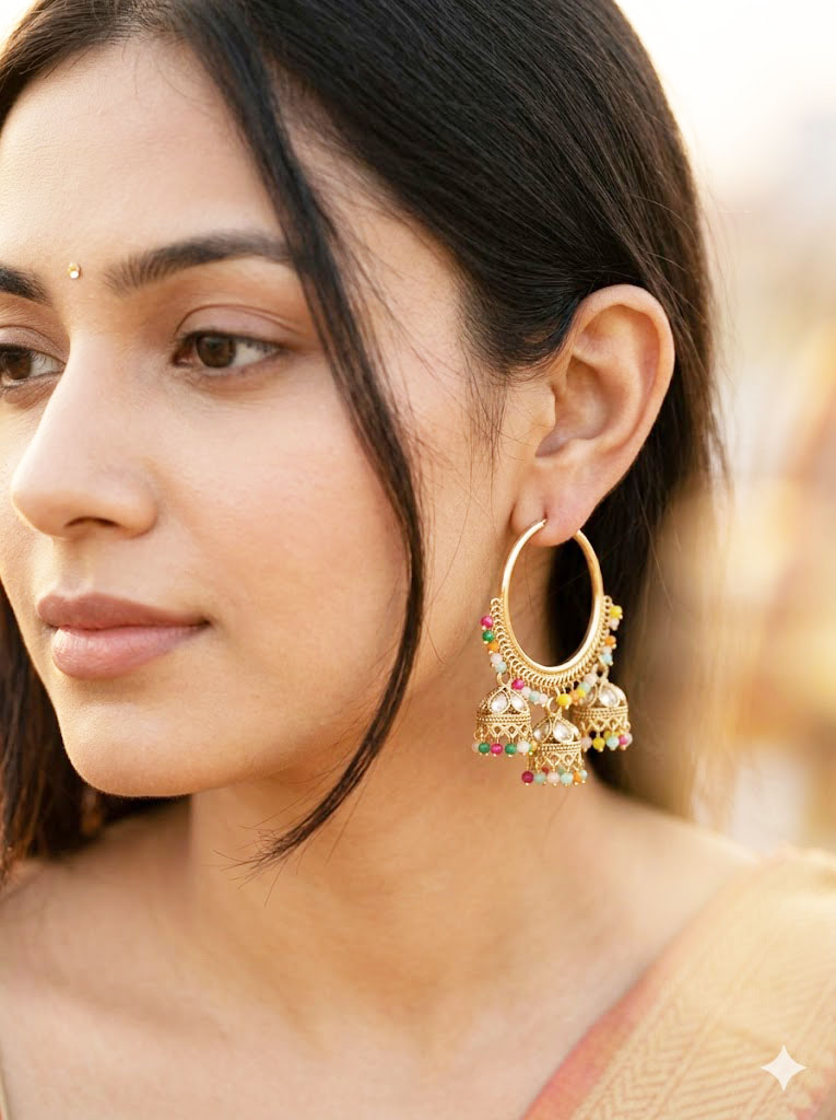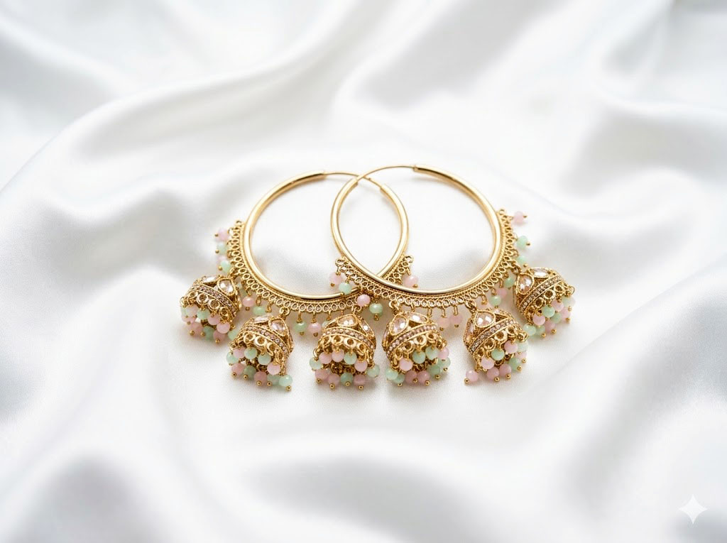 | Elevate your ethnic wardrobe with these exquisite gold-toned hoop earrings. Seamlessly blending the classic circular bali design with traditional elements, these earrings feature a captivating cascade of miniature jhumkis along the bottom curve. Each individual jhumki is intricately detailed with sparkling clear stones and finished with a delicate cluster of pastel pink and mint green beads. The soft, contrasting pastel tones against the rich gold finish make this a versatile and elegant statement piece, perfect for weddings, festive celebrations, or pairing with an elegant saree or lehenga. |