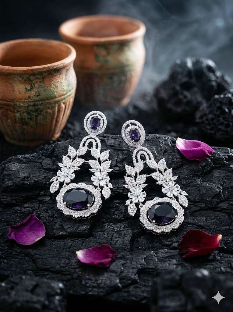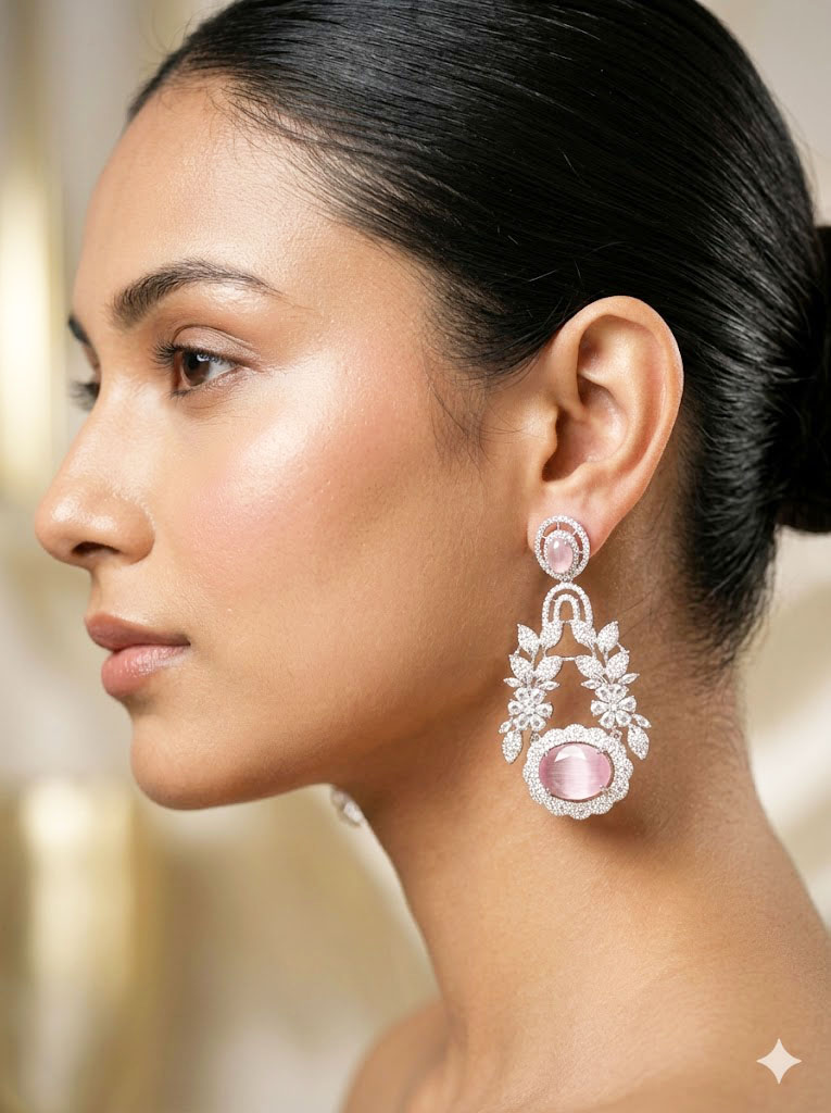 | Elevate any evening ensemble with these stunning statement earrings. Crafted with meticulous attention to detail, they feature a brilliant array of clear, sparkling stones arranged in delicate floral and leaf motifs. The elaborate design is anchored by exquisite, soft pink and purple oval stones that provide a romantic pop of color against the silver-toned setting. As a signature offering from the Malini Jewels line, these pieces are designed to catch the light beautifully, making them an ideal choice for weddings, galas, and festive celebrations. |