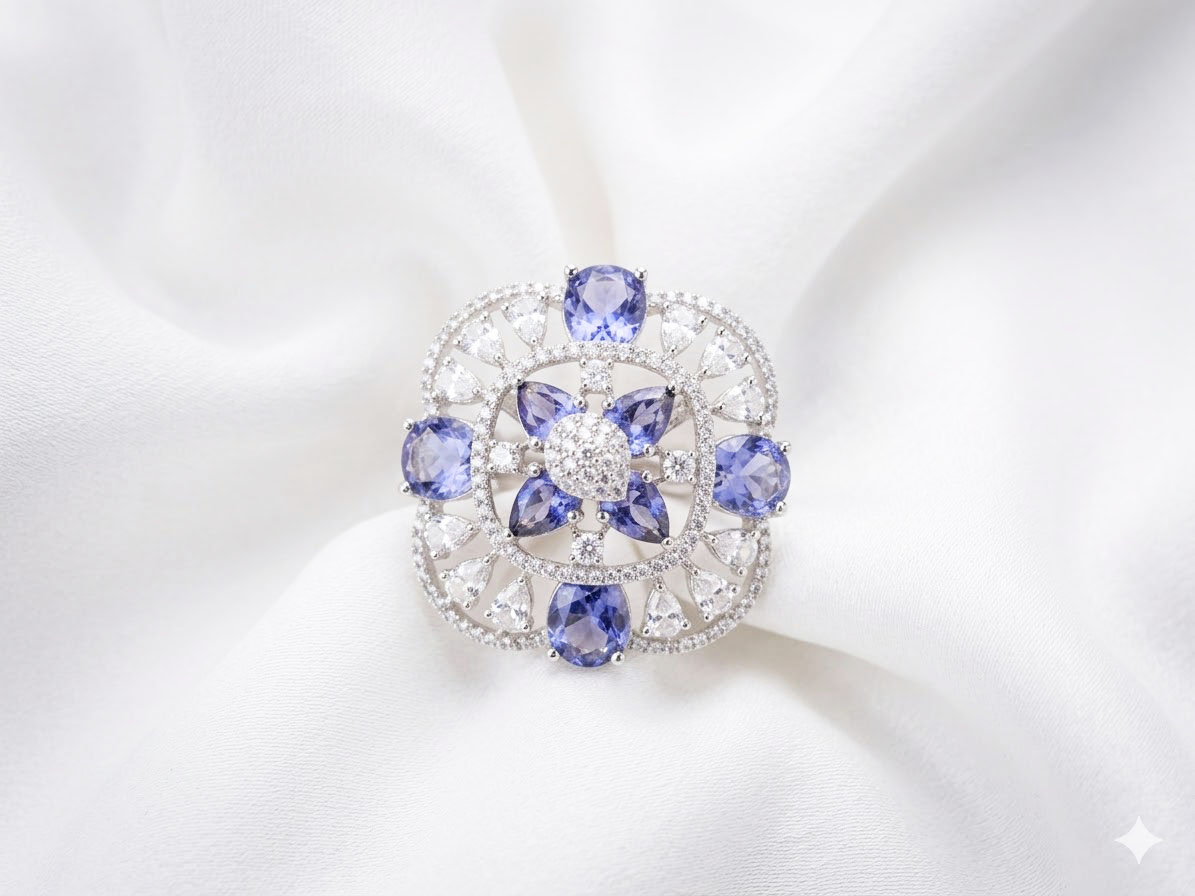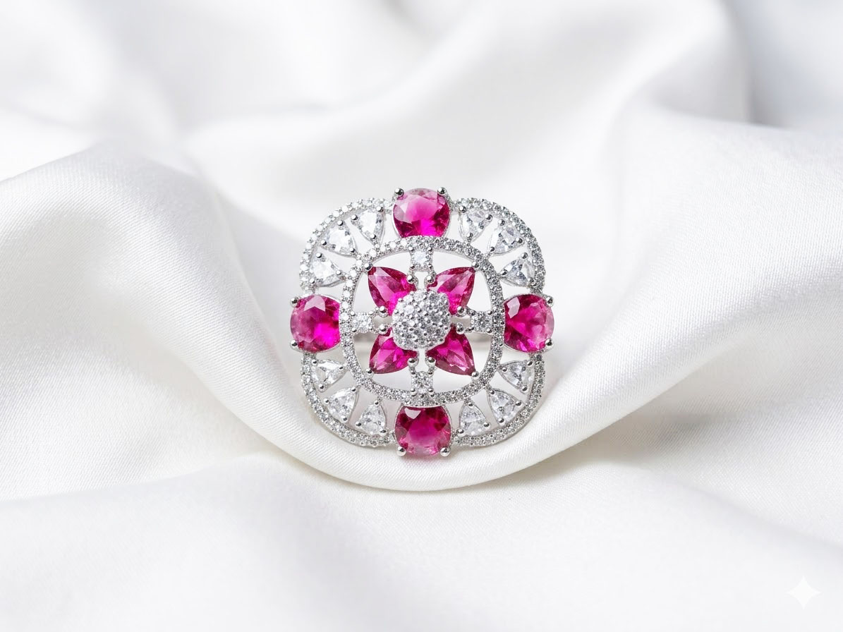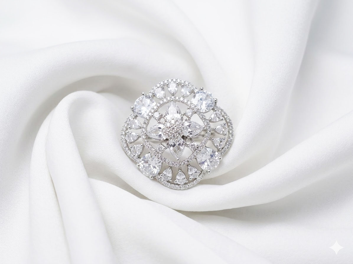 | Elevate your evening ensemble with this exquisite statement piece. Crafted with meticulous attention to detail, this magnificent accessory features a breathtaking mandala-inspired floral design. At its heart lies a clustered center, radiating outward with a combination of marquise, pear, and brilliant round-cut clear stones. The silver-toned setting enhances the brilliant sparkle of the American Diamonds (Cubic Zirconia), creating a luxurious, diamond-like finish. Perfect for weddings, galas, and festive occasions, this striking piece is designed to capture the light and draw the eye from every angle. |
