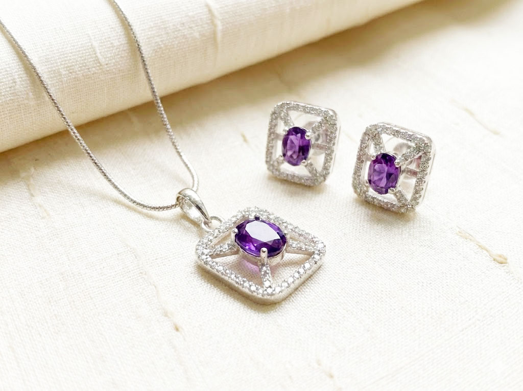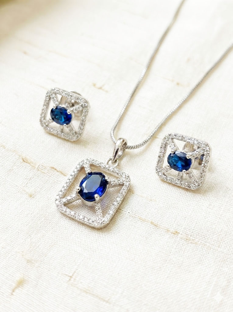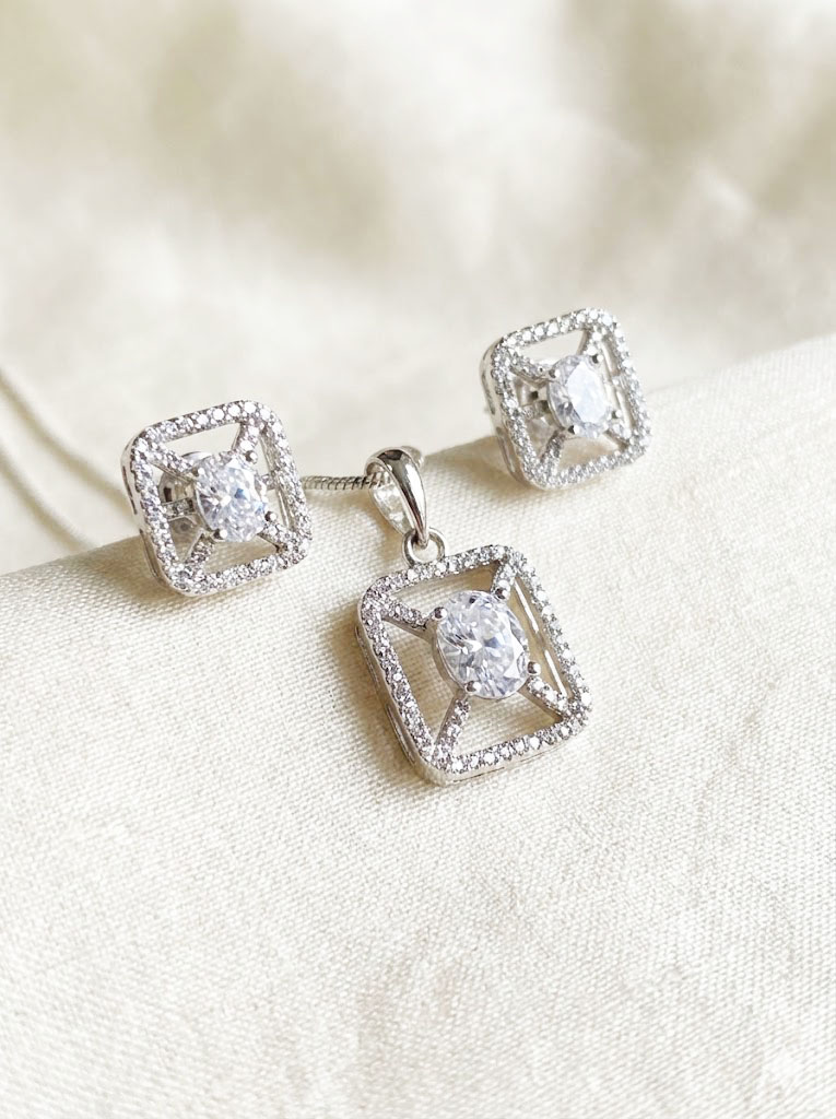 Elevate your everyday elegance with this beautifully crafted geometric pendant and earring set. Featuring a stunning, brilliant-cut oval center stone, the design is framed by a micro-paved square halo that catches the light from every angle. The sophisticated criss-cross setting adds a modern, architectural touch to the classic silver-tone finish. Complete with matching stud earrings and a delicate box chain, this versatile set transitions seamlessly from professional office wear to evening glamor.