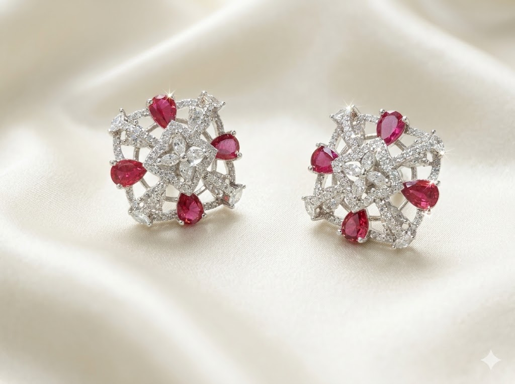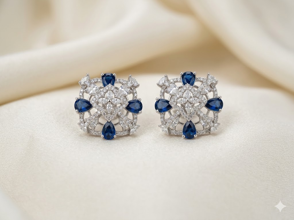 | Earring Style: Stud / Cluster Metal Tone: Silver Stone Color: Clear / White Stone Shapes: Square (center), Pear/Teardrop, Baguette, Round Setting Style: Prong and Pavé settings Backing Type: Post back (standard for this style, visible behind the design) |