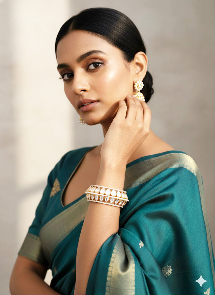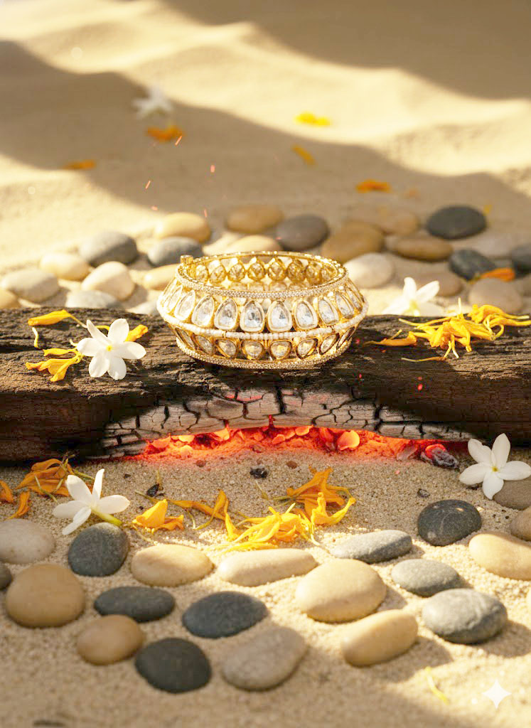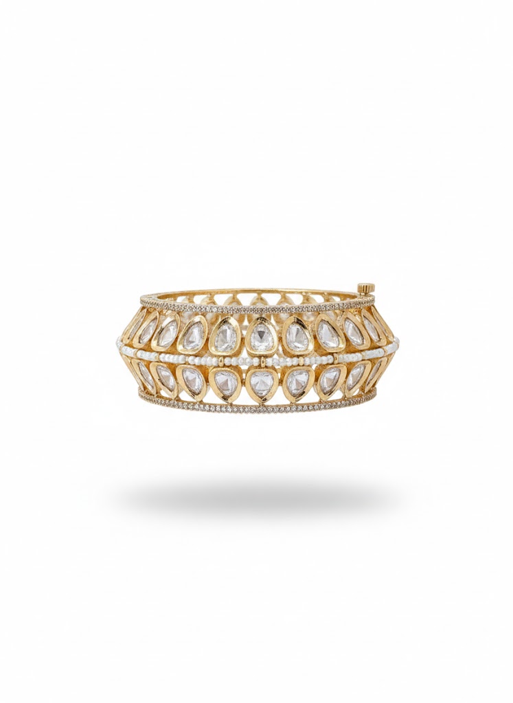 | Base Material: Gold-tone metal (Specific alloy unverified visually; characteristic of brass, copper, or silver base). Stone Type: Faux Polki/Kundan (glass/synthetic uncut diamonds), Faux Seed Pearls, Faux Diamonds/CZ. Bangle Shape: Round (Rigid structure). Profile/Width: Broad, statement width. Style: Traditional Indian, Jadau/Kundan inspired |