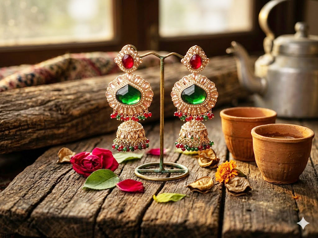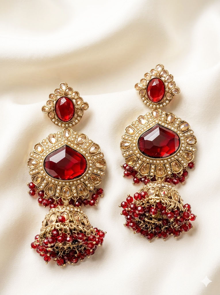 | Base Material: High-quality metal alloy with a premium gold-tone finish Stone Type: Imitation colored gemstones (emerald, ruby, and champagne/pink tones) and faux pearls. Earring Style: Drop Jhumka / Dangler. |