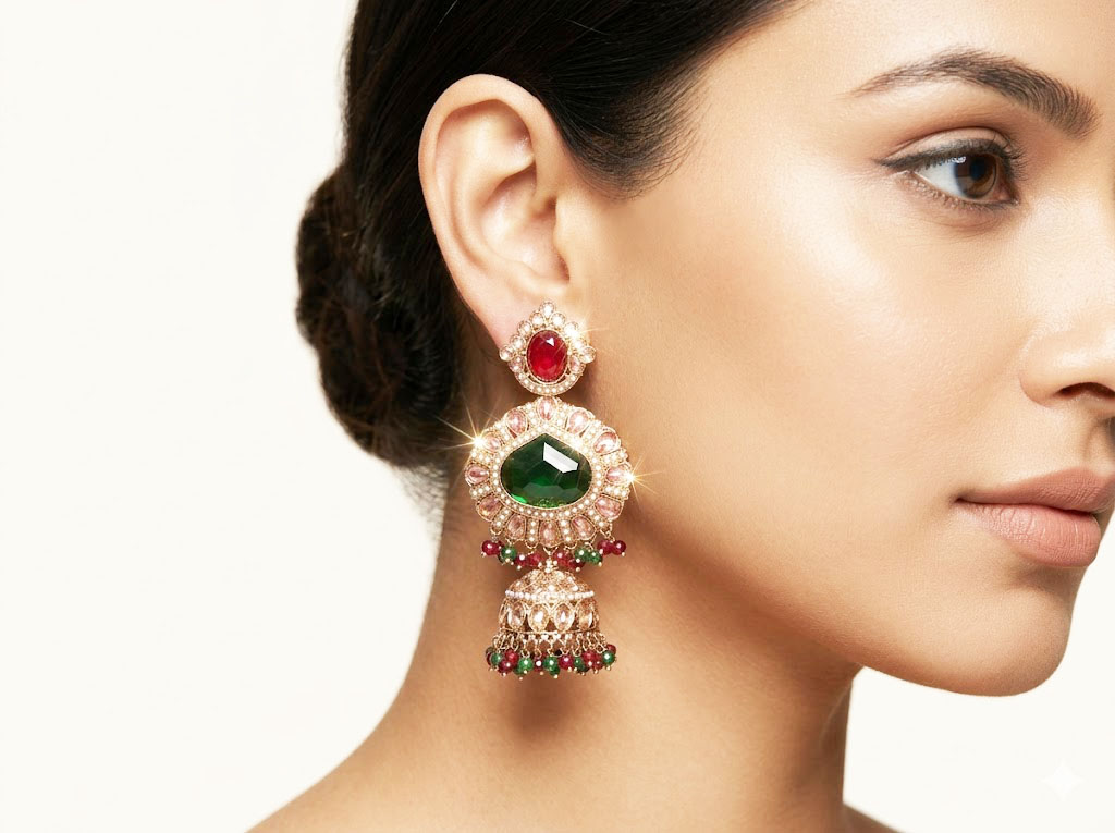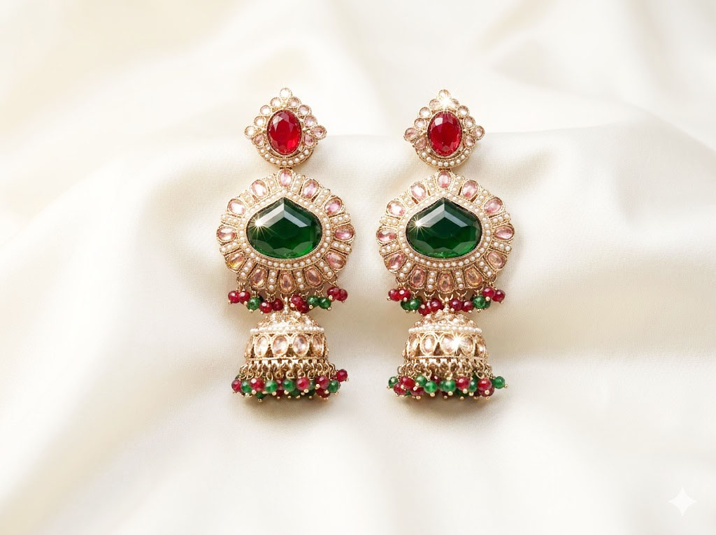 | These exquisite statement jhumkas perfectly capture the essence of traditional artistry. The design features a stunning juxtaposition of a rich emerald-green center stone and a vibrant ruby-red top stud, elegantly framed by delicate pink accents and faux pearl detailing. The ornate gold-toned setting gracefully transitions into a classic bell-shaped jhumka, beautifully finished with clusters of tiny, contrasting red and green beaded drops. The professional photography brilliantly highlights the intricate design elements and the sharp light reflection of the stones, making these earrings an ideal, high-impact focal point for festive and bridal ensembles. |