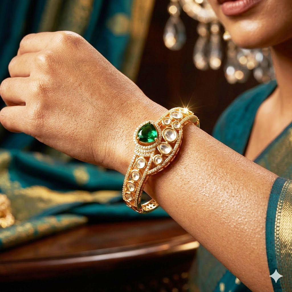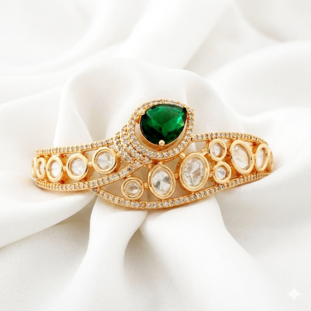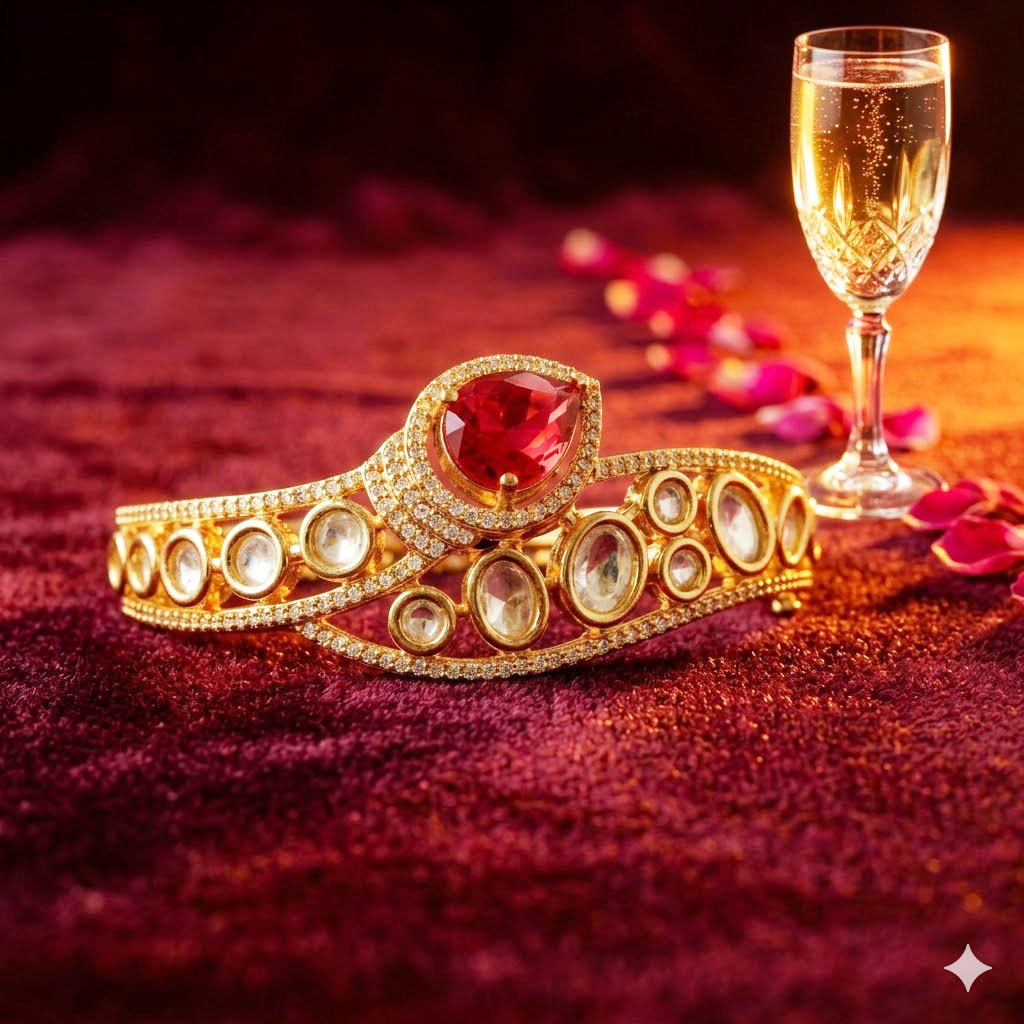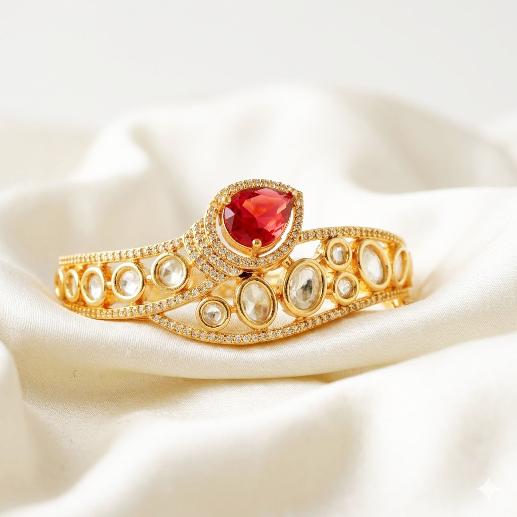 | Metal Finish: High-Polished 22K Gold Plating over Brass/Alloy Main Stone: Pear-Cut Ruby Red Synthetic Gemstone: Secondary Stones Round Brilliant Moissanite Stones Setting Type: Prong, Bezel, and Pave Settings Bangle: Style Hinge-Opening Kada Design: Motif Victorian-Ethnic Fusion |