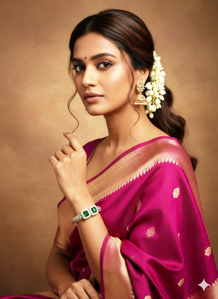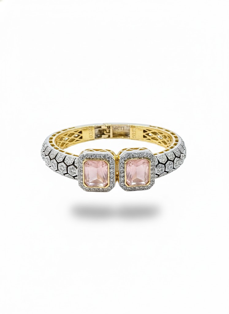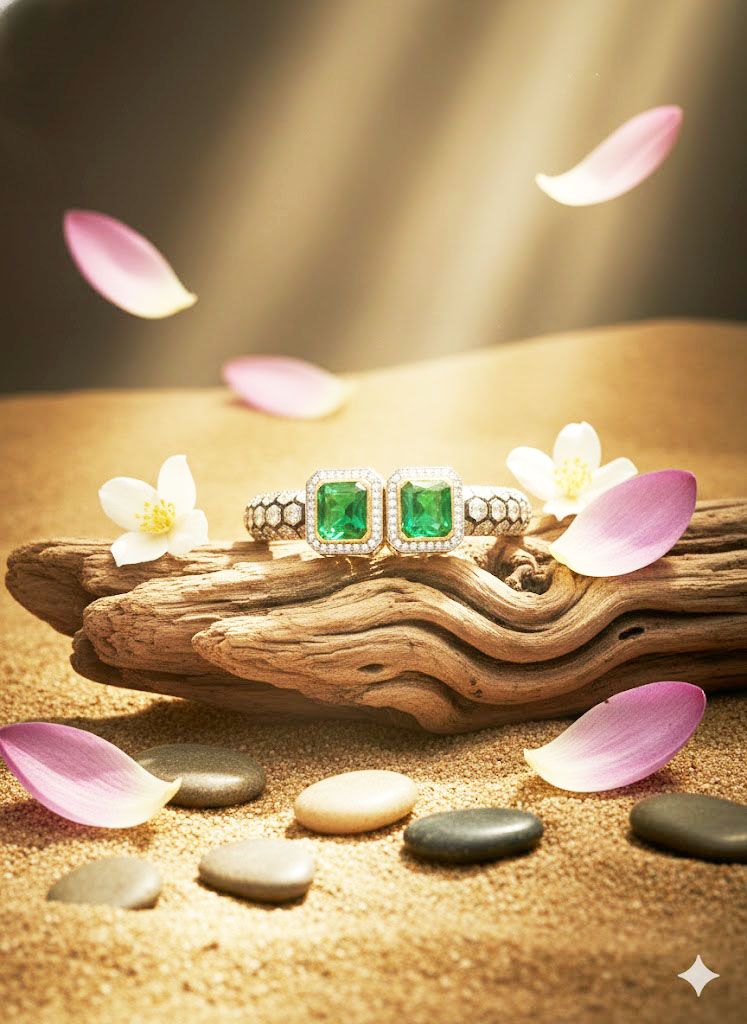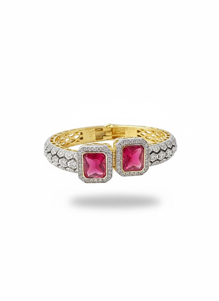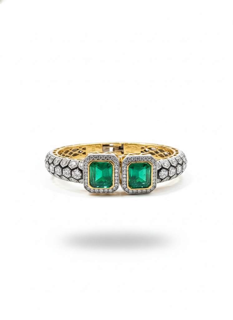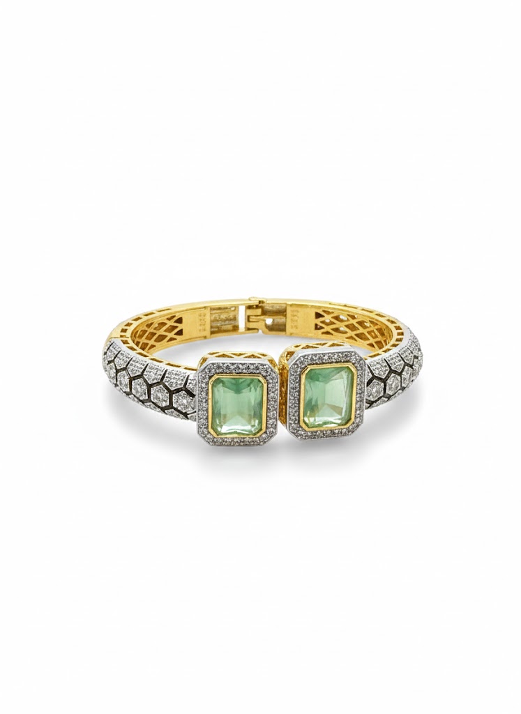 | Stone Shapes: Emerald-cut (rectangular) and Round-cut. Plating/Finish: Dual-tone (Gold and Silver/Rhodium finish). Bracelet Type: Hinged Bangle. Primary Colors: Green, Silver, Gold. |