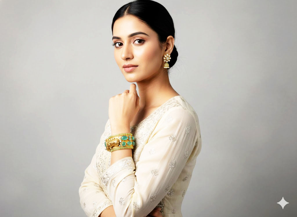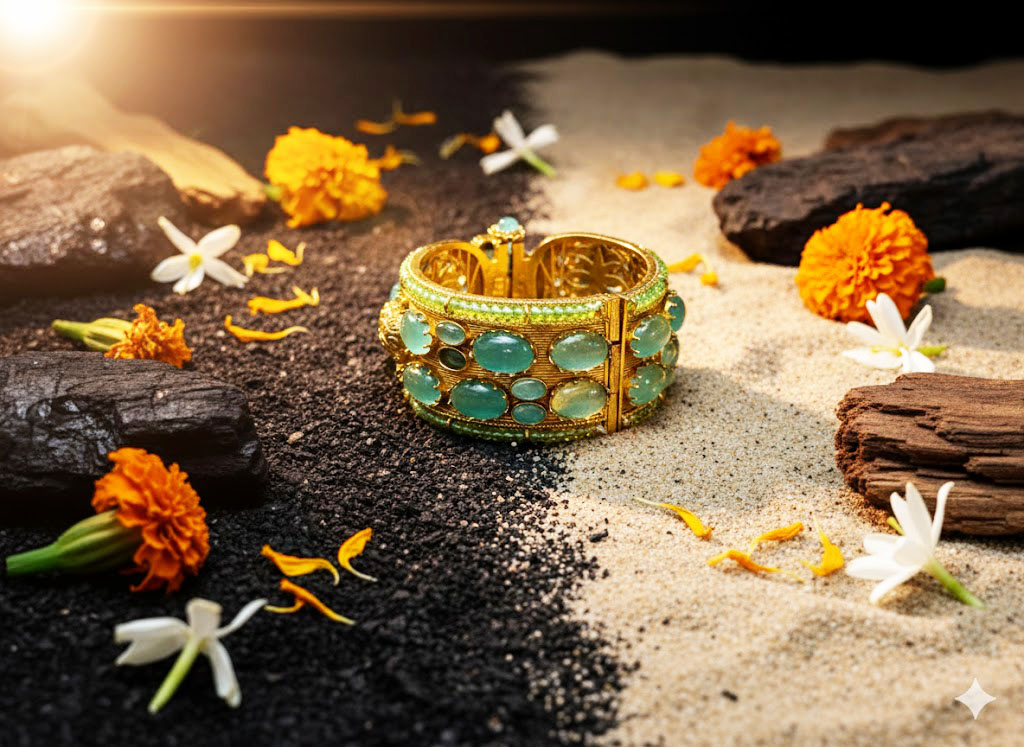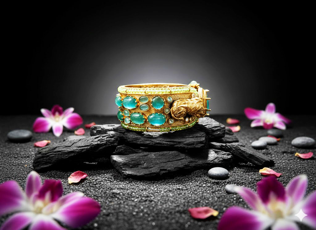 | Base Material: Gold-tone metal (Specific alloy unverified visually; characteristic of brass, copper, or silver base). Stone Type: Faux Polki/Kundan (glass/synthetic uncut diamonds), Faux Seed Pearls, Faux Diamonds/CZ. Bangle Shape: Round (Rigid structure). Profile/Width: Broad, statement width. Style: Traditional Indian, Jadau/Kundan inspired |